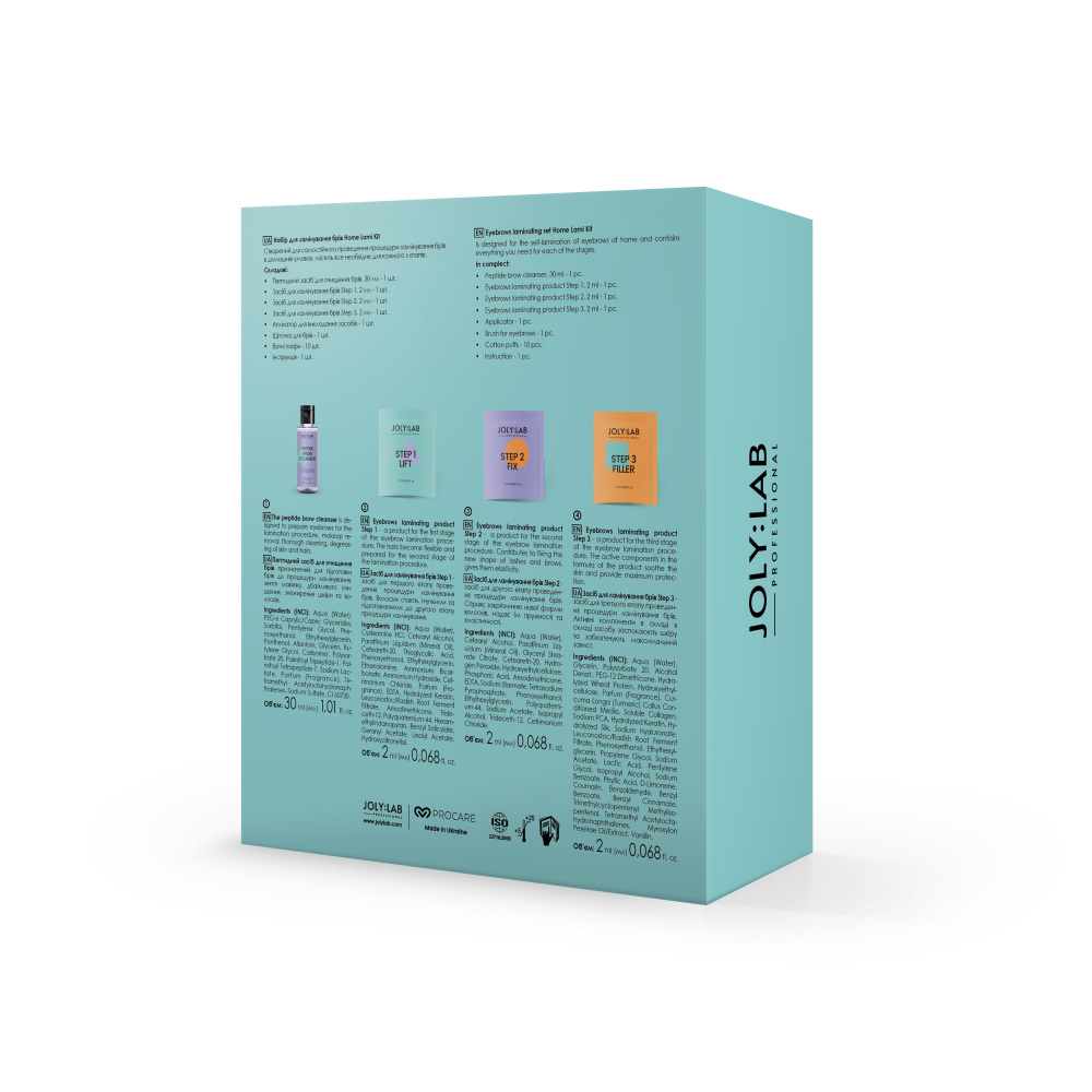 Набор Home Lami Kit JOLY:LAB создан для самостоятельного проведения процедуры ламинирования бровей в домашних условиях, содержащих все необходимое для каждого из этапов. Пептидное средство для очищения бровей помогает очистить и подготовить кожу и волоски к процедуре. Средства для ламинирования обеспечивают надежную и длительную фиксацию всем типам волосков, включая непослушные и жесткие. Активные компоненты средств позволяют быстро, эффективно и безопасно провести процедуру ламинирования даже дома, а уходовые – делают волоски послушными и блестящими. Набор также содержит аппликатор, щеточку и ватные пафы, помогающие комфортно выполнить процедуру. Эффект ламинирования держится до 4 недель.
